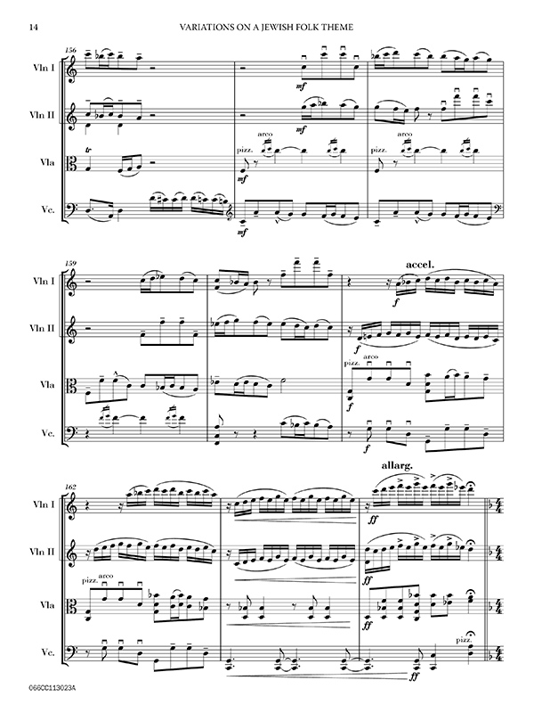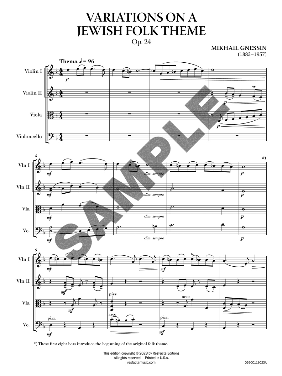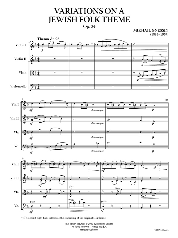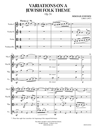 “Variations on a Jewish Folk Theme, Op. 24” is a compelling and expressive work for string quartet by Russian Jewish composer and teacher, Mikhail Gnessin. Completed in 1917, this piece showcases Gnessin's mastery in incorporating Jewish folk elements into classical music.