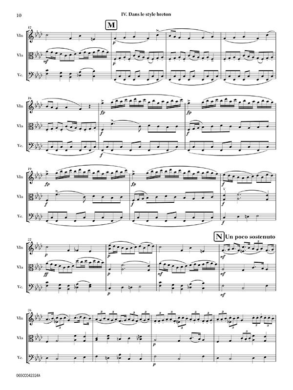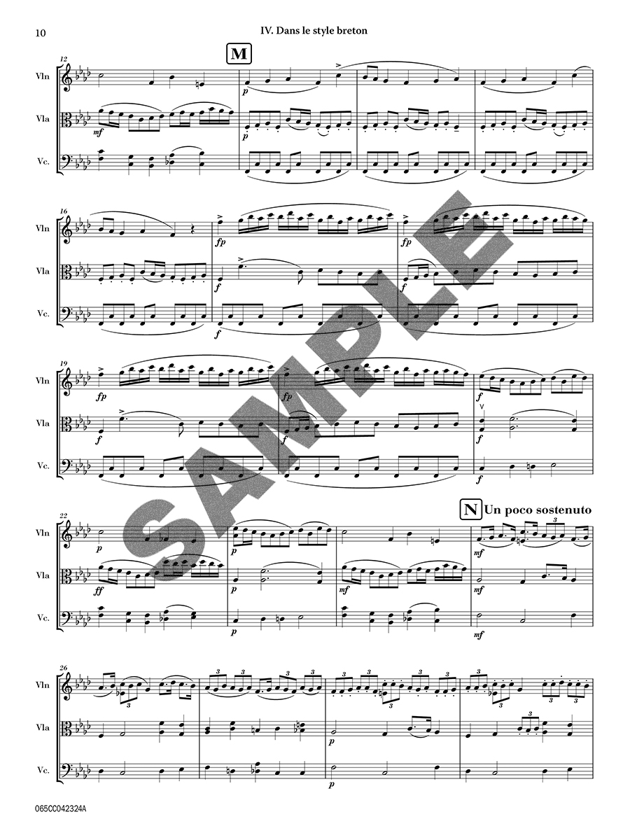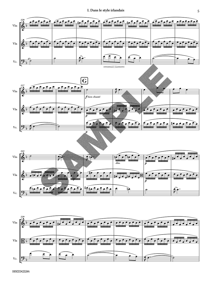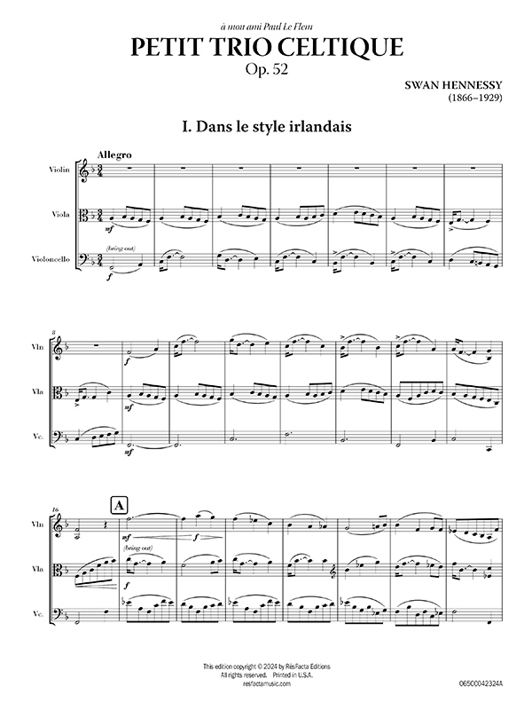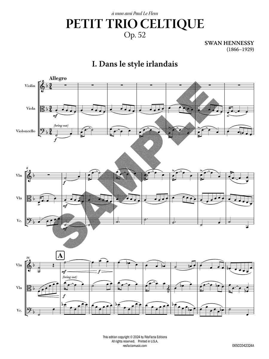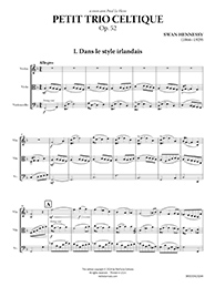 Swan Hennessy, an Irish-American composer born in 1866 and spent much of his life in France, was heavily influenced by his Celtic heritage. His Petit Trio Celtique, Op. 52 incorporates lively and spirited melodies that evoke the traditional music of Ireland, accompanied by rich harmonies and rhythmic patterns reminiscent of Celtic folk dances like jigs and reels. As the work's title suggests, Petit Trio Celtique has a more intimate and less formal character compared to larger chamber compositions. Despite its smaller scale, the piece is often praised for its charm, elegance, and the skillful integration of Celtic motifs into the classical chamber music idiom.