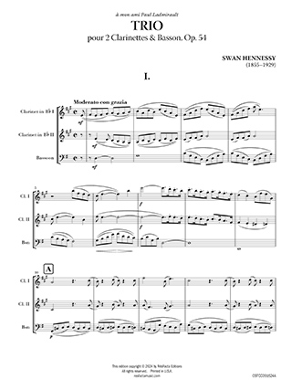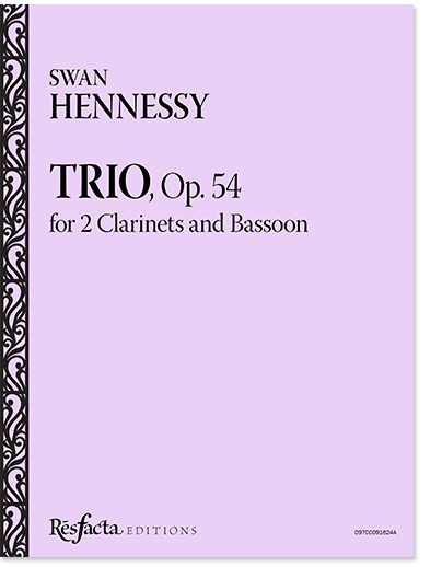 Swan Hennessy’s Trio for 2 Clarinets and Bassoon, Op. 54, composed in 1927, showcases his signature fusion of Celtic folk influences with a late-Romantic harmonic language. Hennessy, an American composer of Irish descent who spent much of his career in Paris, is known for blending traditional European classical forms with folk melodies and rhythms. Hennessy's music in this period combines the impressionistic tendencies of French music with the rhythmic and modal influences of Irish folk traditions. Hennessy imbues the piece with a lyrical charm, vivid character, and rhythmic vitality.