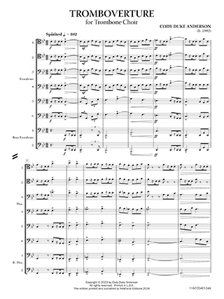 Tromboverture is celebration of the trombone choir. Beginning with a lively and joyous motif, it dances among the players. Transitioning to the middle segment, a grand melody emerges, evoking strength and confidence. The concluding section merges the earlier themes, culminating in a vibrant and triumphant finale!