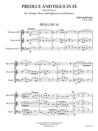 Oskar Böhme’s “Prelude and Fugue, Op. 28, No. 1” for is a captivating piece that showcases the virtuosity and unique timbral qualities of these brass instruments. The composition is divided into two distinct sections: the Prelude and the Fugue. The Prelude, in C minor, features melodic lines intertwined among the trumpet, horn, and baritone, creating a rich tapestry of harmonies and textures. The Fugue displays intricate interplay among the instruments, showcasing their individual characteristics while harmonizing together to create a cohesive and intricate musical fabric. Scored for Trumpet (B♭), Horn (E♭), and Euphonium (C). Set includes parts for Horn in F and Baritone in B♭.