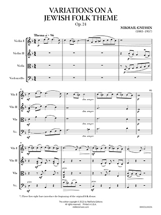 “Variations on a Jewish Folk Theme, Op. 24” is a compelling and expressive work for string quartet by Russian Jewish composer and teacher, Mikhail Gnessin. Completed in 1917, this piece showcases Gnessin's mastery in incorporating Jewish folk elements into classical music.