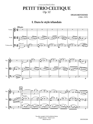 Swan Hennessy, an Irish-American composer born in 1866 and spent much of his life in France, was heavily influenced by his Celtic heritage. His Petit Trio Celtique, Op. 52 incorporates lively and spirited melodies that evoke the traditional music of Ireland, accompanied by rich harmonies and rhythmic patterns reminiscent of Celtic folk dances like jigs and reels. As the work's title suggests, Petit Trio Celtique has a more intimate and less formal character compared to larger chamber compositions. Despite its smaller scale, the piece is often praised for its charm, elegance, and the skillful integration of Celtic motifs into the classical chamber music idiom.