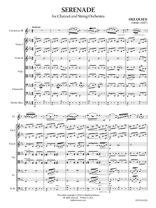 Ole Olsen (1850–1927) was a prominent figure in Norwegian music during the late 19th and early 20th centuries. His “Serenade for Clarinet and String Orchestra” showcases his melodic craftsmanship and skillful orchestration. The composition follows the traditional structure of a light and often romantic piece, evoking a pleasant, serene atmosphere. The inclusion of the clarinet as a solo instrument adds a distinctive character to the piece, allowing for expressive and lyrical passages. A version for Clarinet and Piano (piano reduction by the composer) is also available from the publisher (catalog number 007CC121123B).