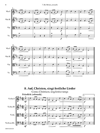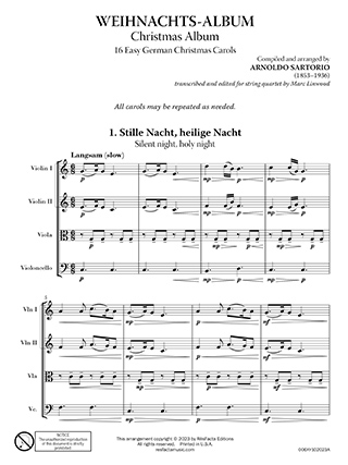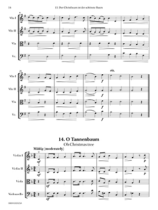 A collection of 16 popular German Christmas carols in easy arrangements for string quartet, suitable for public performance, holiday gatherings, and worship services. Titles include: “Silent Night,” “Lo, How a Rose e’er Blooming,” “Shepherds, Awake,” “Come, Little Children,” “Oh, Christmas Tree,” and more.