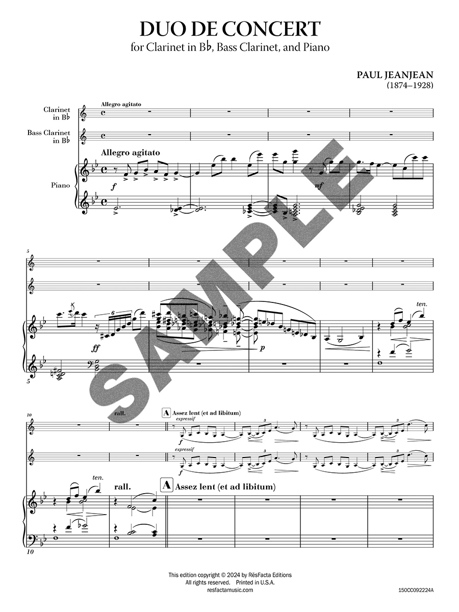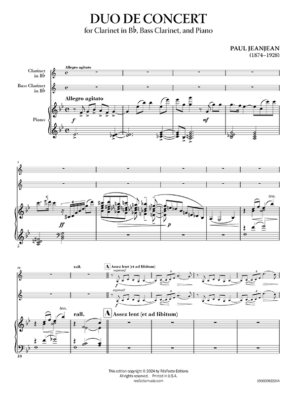 Duo de Concert by Paul Jeanjean is a charming and dynamic piece written for clarinet, bass clarinet, and piano. Jeanjean, a prominent French composer and clarinetist, is well-known for his technical studies for clarinet, but in this work, he explores the chamber music format with a focus on the interplay between the clarinet and bass clarinet, supported by the piano.