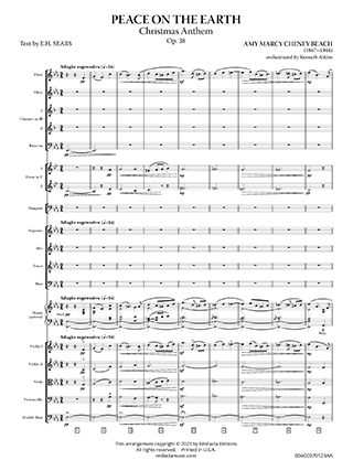 Originally for SATB chorus and organ, Amy Beach’s PEACE ON THE EARTH: Christmas Anthem, Op. 38 is a Brahmsian setting of familiar Christmas texts by E.H. Sears. The accompaniment has been orchestrated for a small orchestra of woodwinds, horns, timpani, organ (optional), and strings. The orchestration may also be performed with strings only.