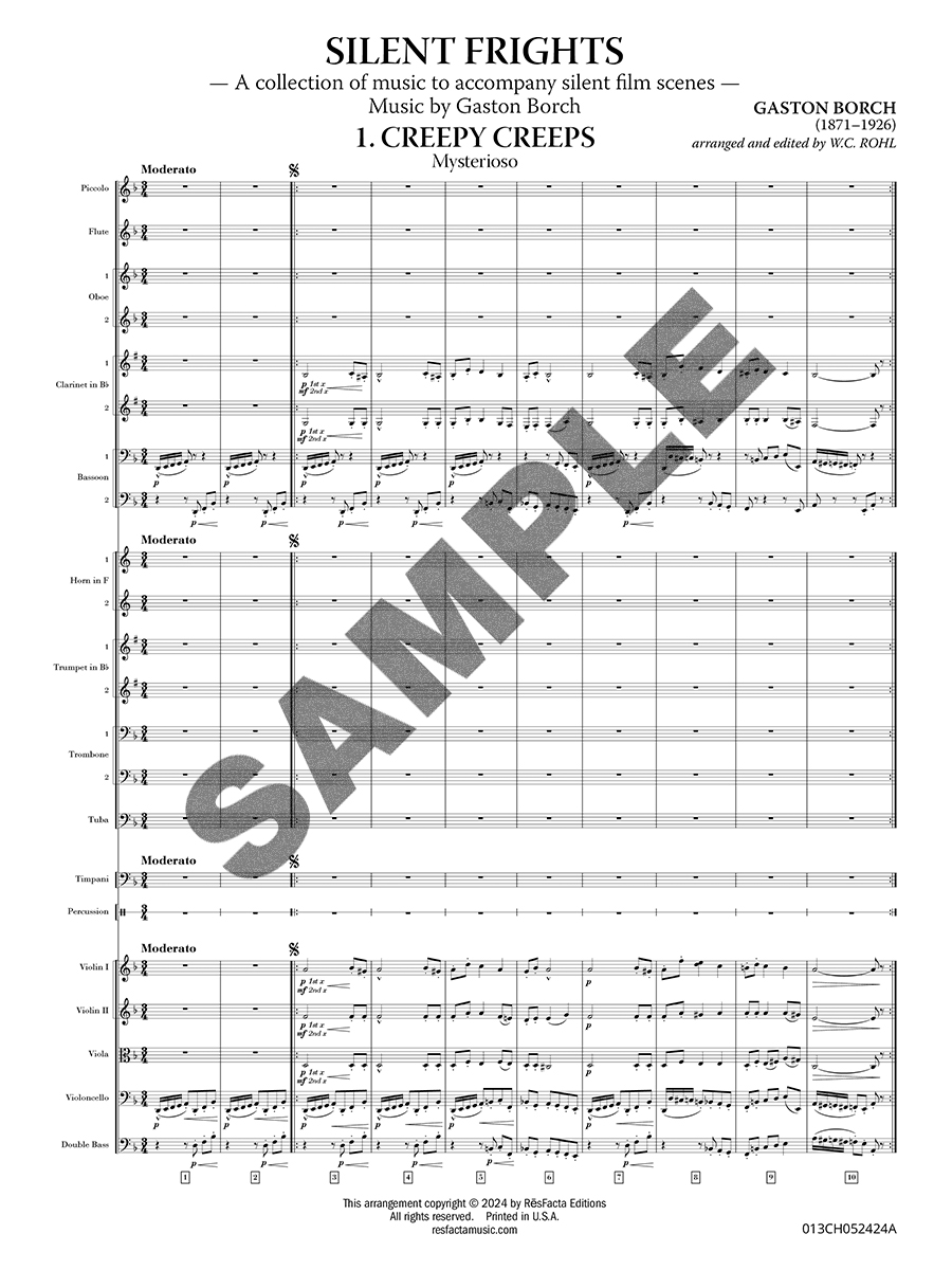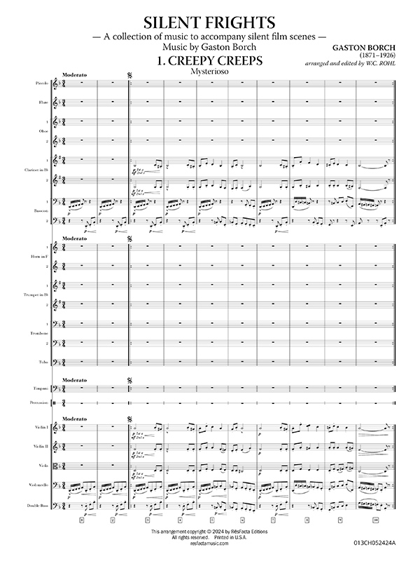 A collection of five pieces for orchestra by French composer, Gaston Borch (1871-1926) written to accompany creepy, suspenseful, mysterious, and supernatural scenes for silent films. A prolific composer, cellist, conductor, and arranger, Borch moved to the United States in the early 1900s where he significantly contributed to the American musical landscape. He became particularly known for his work in the burgeoning field of silent film music, composing scores that enhanced the emotional impact of films. Borch’s music was characterized by its melodic richness and dramatic expressiveness, which made it ideal for the cinema. His ability to craft music that perfectly matched the narrative and emotional arcs of films made him a sought-after composer in the industry. The entire collection - or any number of the individual selections - would make an ideal addition to any Halloween-themed program. Score and parts.