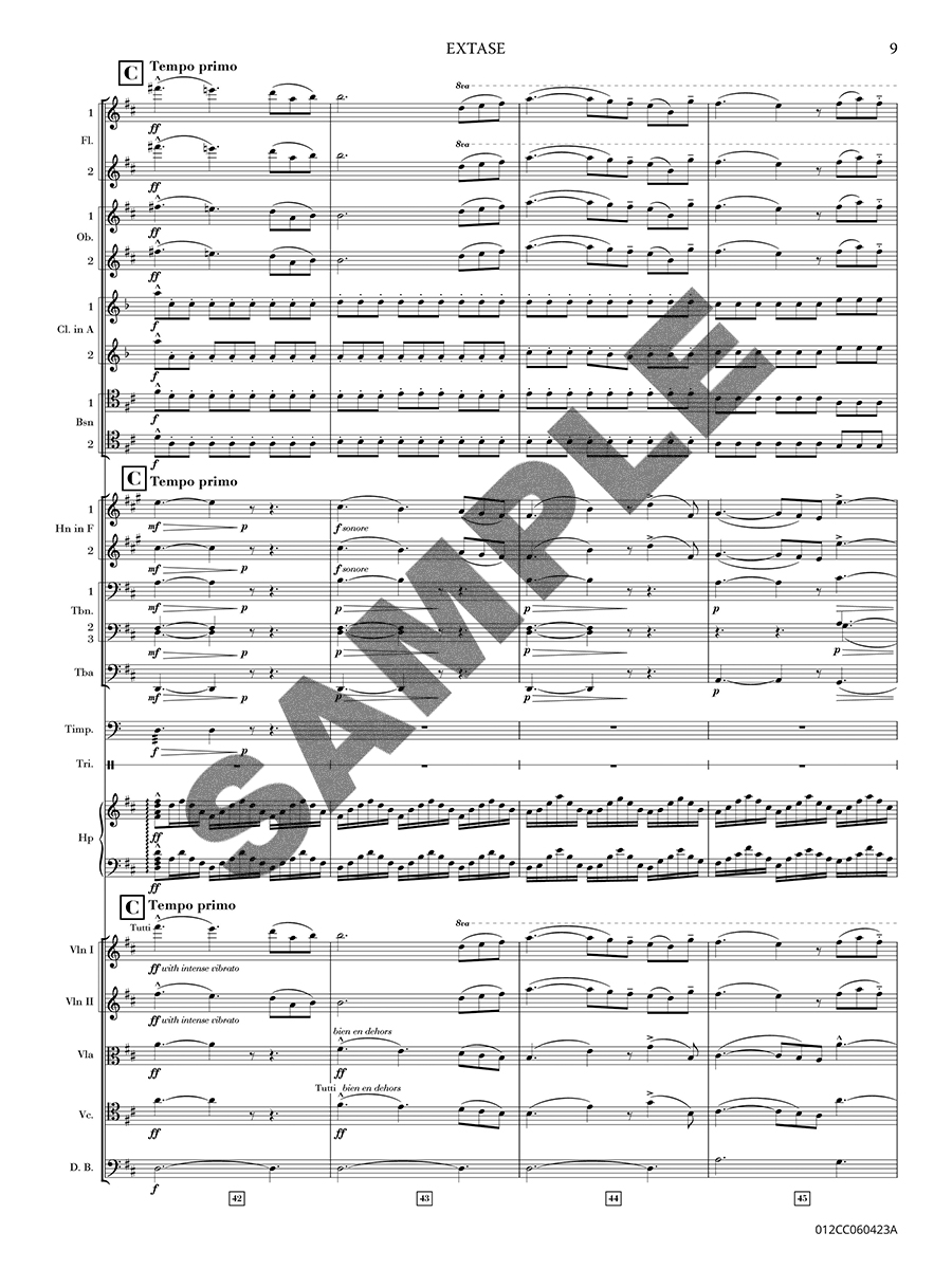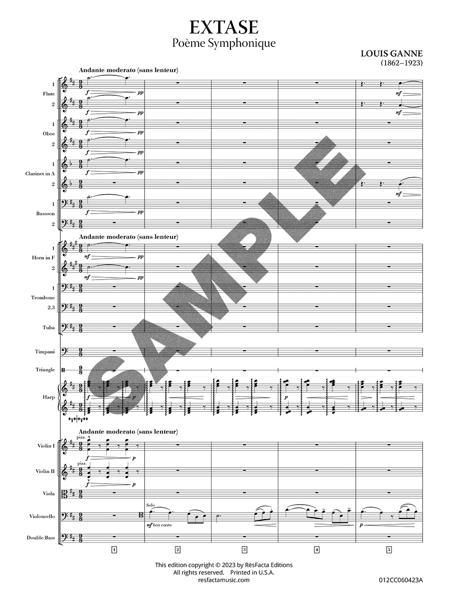 A captivating symphonic poem that immerses the listener in a world of passion and emotional intensity. With lush harmonies, soaring melodies, and a dynamic orchestration, Ganne weaves a musical narrative that explores the overwhelming sensations of ecstasy. From its gentle and evocative introduction to the powerful and dramatic climaxes, the composition takes the listener on a journey through a range of emotions. The work includes solo passages for the first-chair violin and cello players and a prominent part for the harp. An optional organ obligato part is included as are alternate B-flat clarinet parts transposed from the original parts for Clarinet in A.