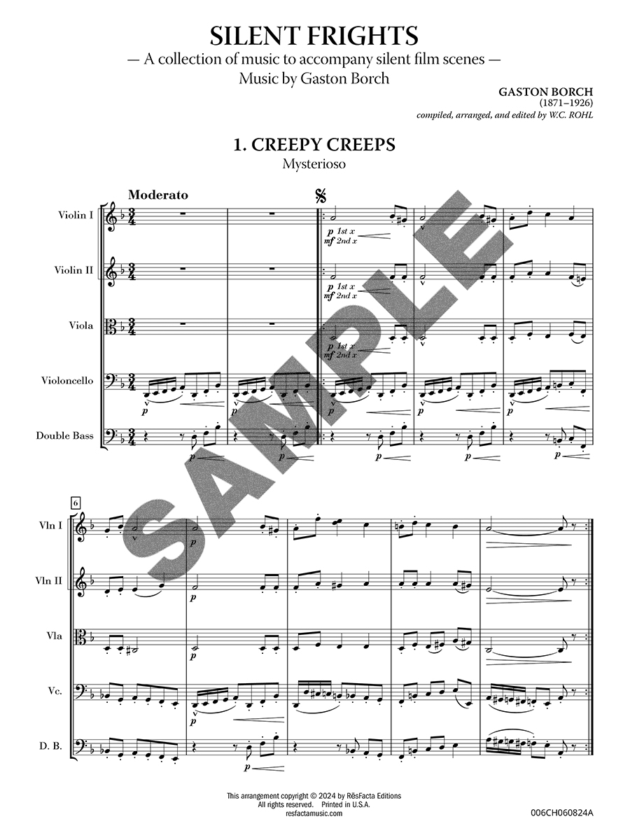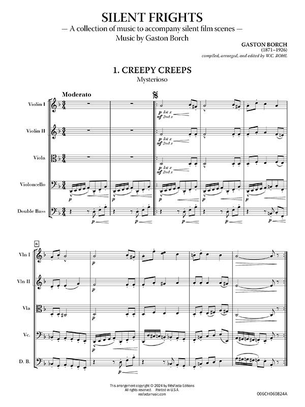 A collection of five pieces for orchestra by French composer, Gaston Borch (1871-1926) written to accompany creepy, suspenseful, mysterious, and supernatural scenes for silent films. A prolific composer, cellist, conductor, and arranger, Borch moved to the United States in the early 1900s where he significantly contributed to the American musical landscape. He became particularly known for his work in the burgeoning field of silent film music, composing scores that enhanced the emotional impact of films. Borch’s music was characterized by its melodic richness and dramatic expressiveness, which made it ideal for the cinema. His ability to craft music that perfectly matched the narrative and emotional arcs of films made him a sought-after composer in the industry. The entire collection - or any number of the individual selections - would make an ideal addition to any Halloween-themed program. Score and parts.