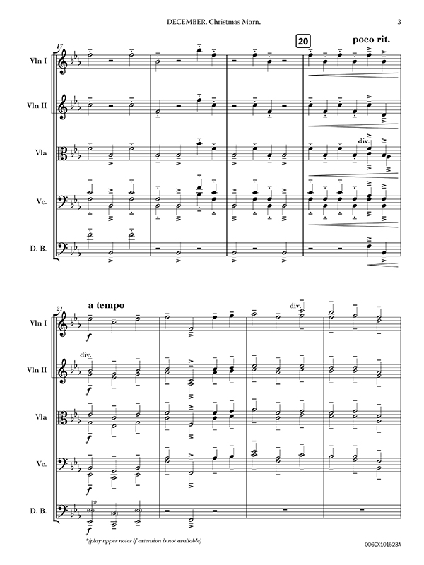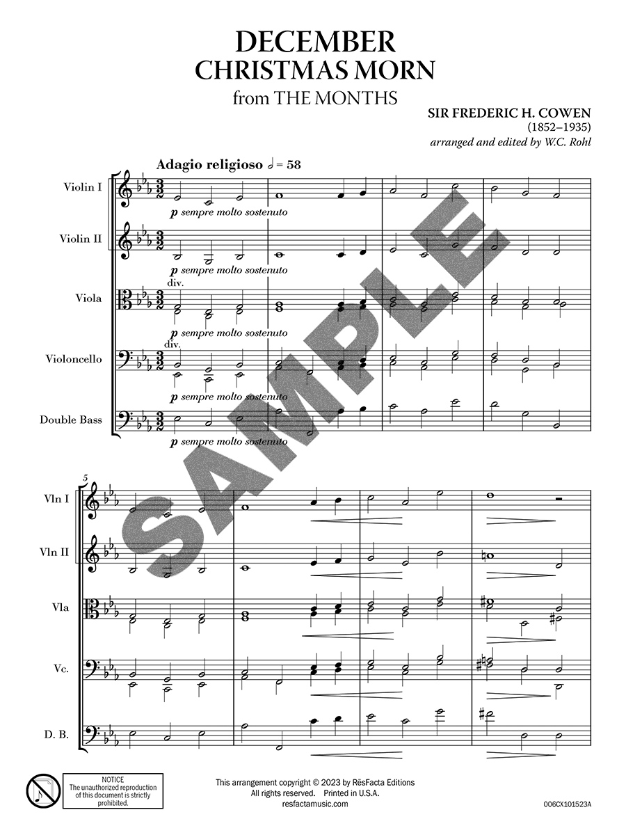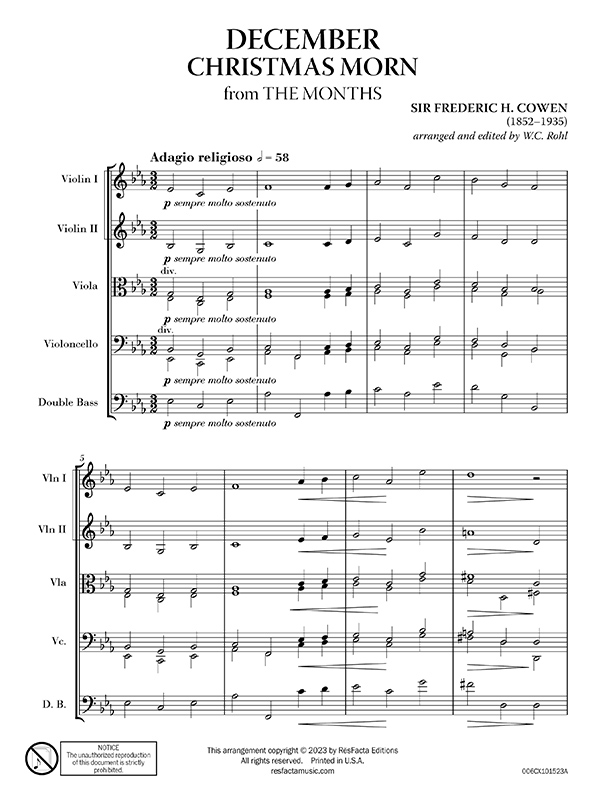 Originally for solo piano, Frederic Cowen’s THE MONTHS is a collection of 12 pieces, each dedicated to a specific month of the year and is intended to evoke the unique characteristics and atmosphere associated with that time of the year. The final movement, “DECEMBER. Christmas Morn.” captures the frosty and tranquil atmosphere of a Christmas morning, evoking a delicate, serene snowfall.