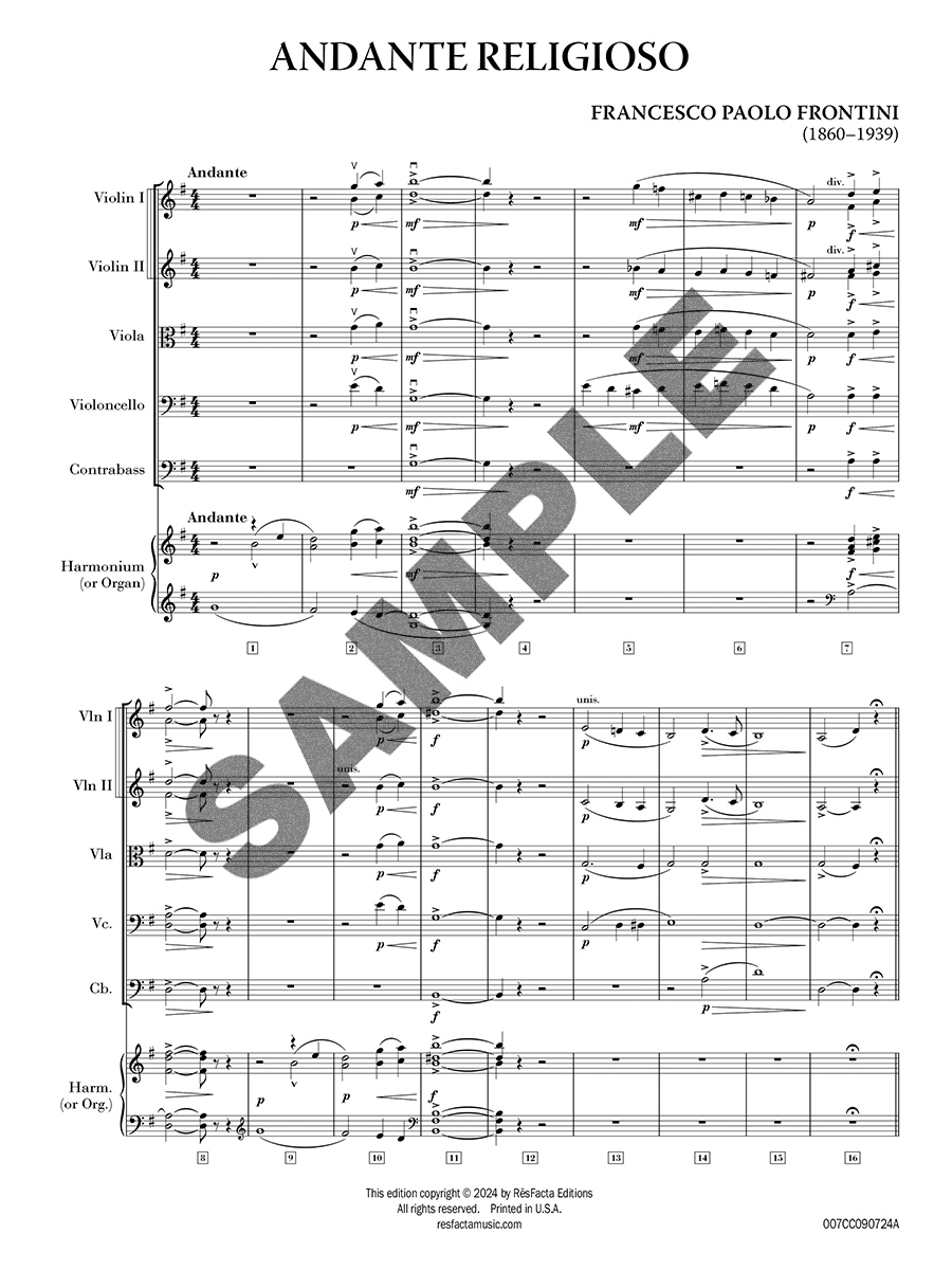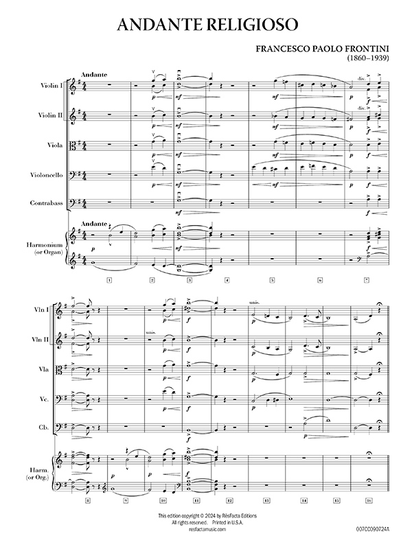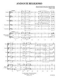Francesco Paolo Frontini’s Andante Religioso is a contemplative, serene work for string orchestra and harmonium, composed in the late 19th century. Reflecting Frontini’s sensitivity to spiritual themes and Italian romanticism, the piece combines lyrical expression with a solemn, meditative atmosphere. The andante tempo sets a moderate, flowing pace, perfectly aligned with the religioso character, which imbues the music with a reverent, sacred tone.