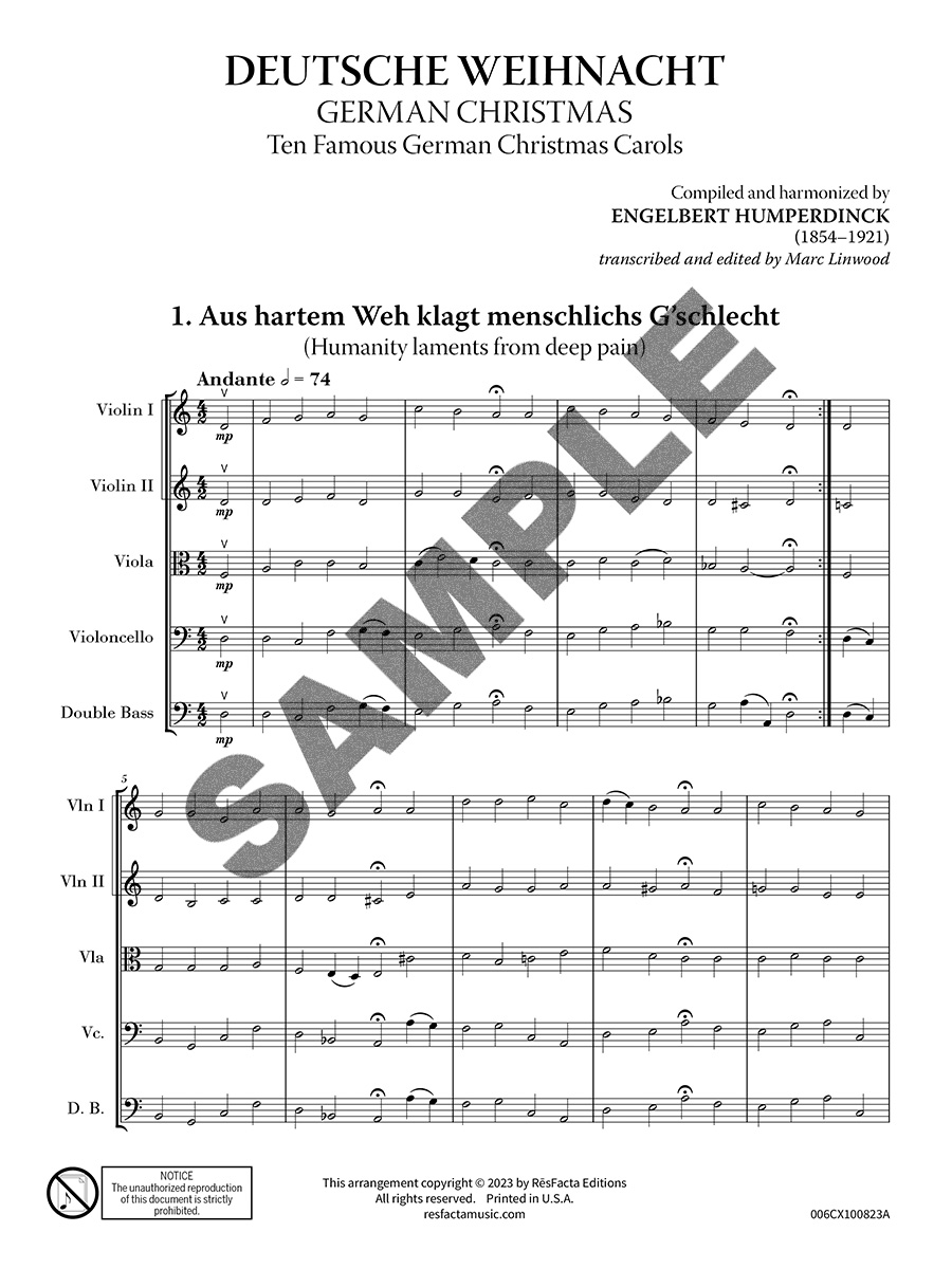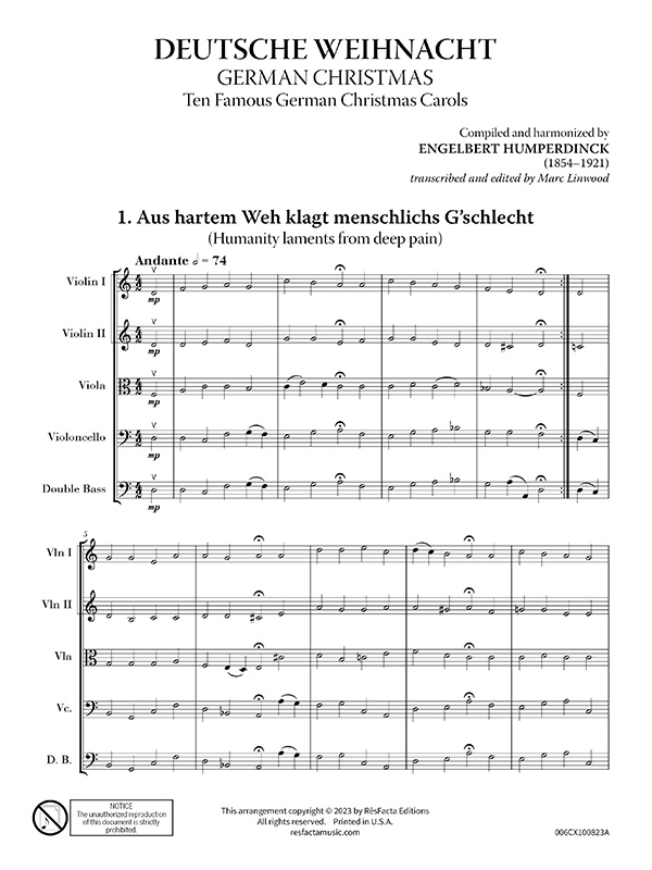 Best known for his opera “Hansel and Gretel,” composer Engelbert Humperdinck compiled this set of 10 classic German carols to accompany the publication of “Deutsche Weihnacht” by Adelheid Wette, a poem about a man ringing a church's bells for Christmas. Each carol is arranged by Humperdinck in simple hymn-like settings and have been transcribed for string orchestra.