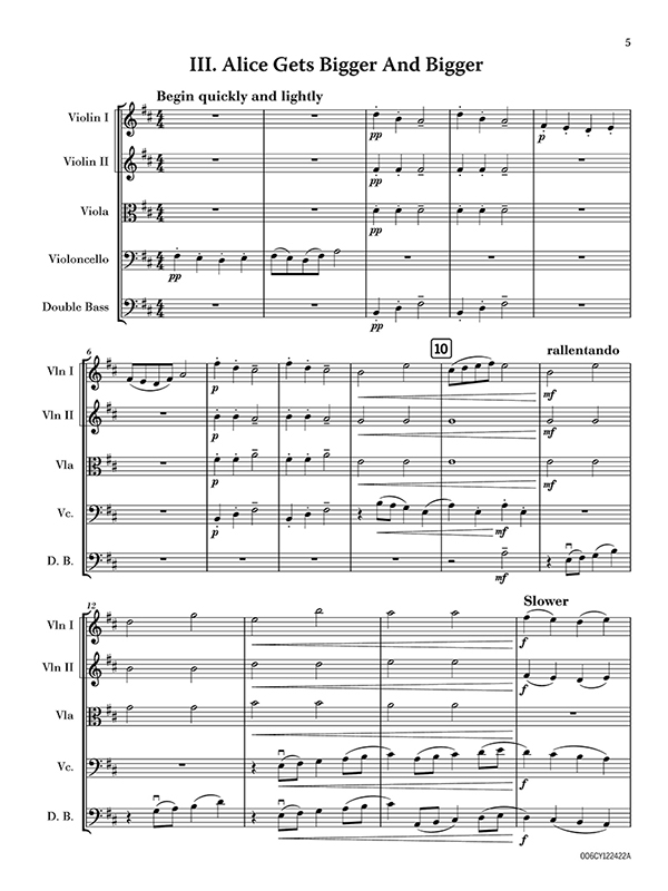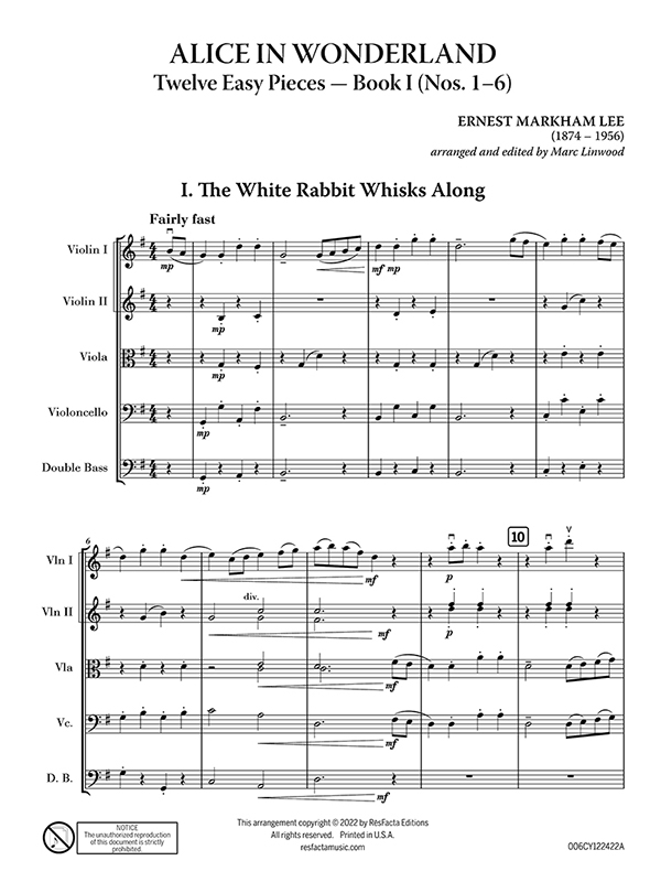 Six easy pieces inspired by the Lewis Carroll’s classic novel, “Alice’s Adventures in Wonderland” by English composer, Ernest Markham Lee, arranged for string orchestra.