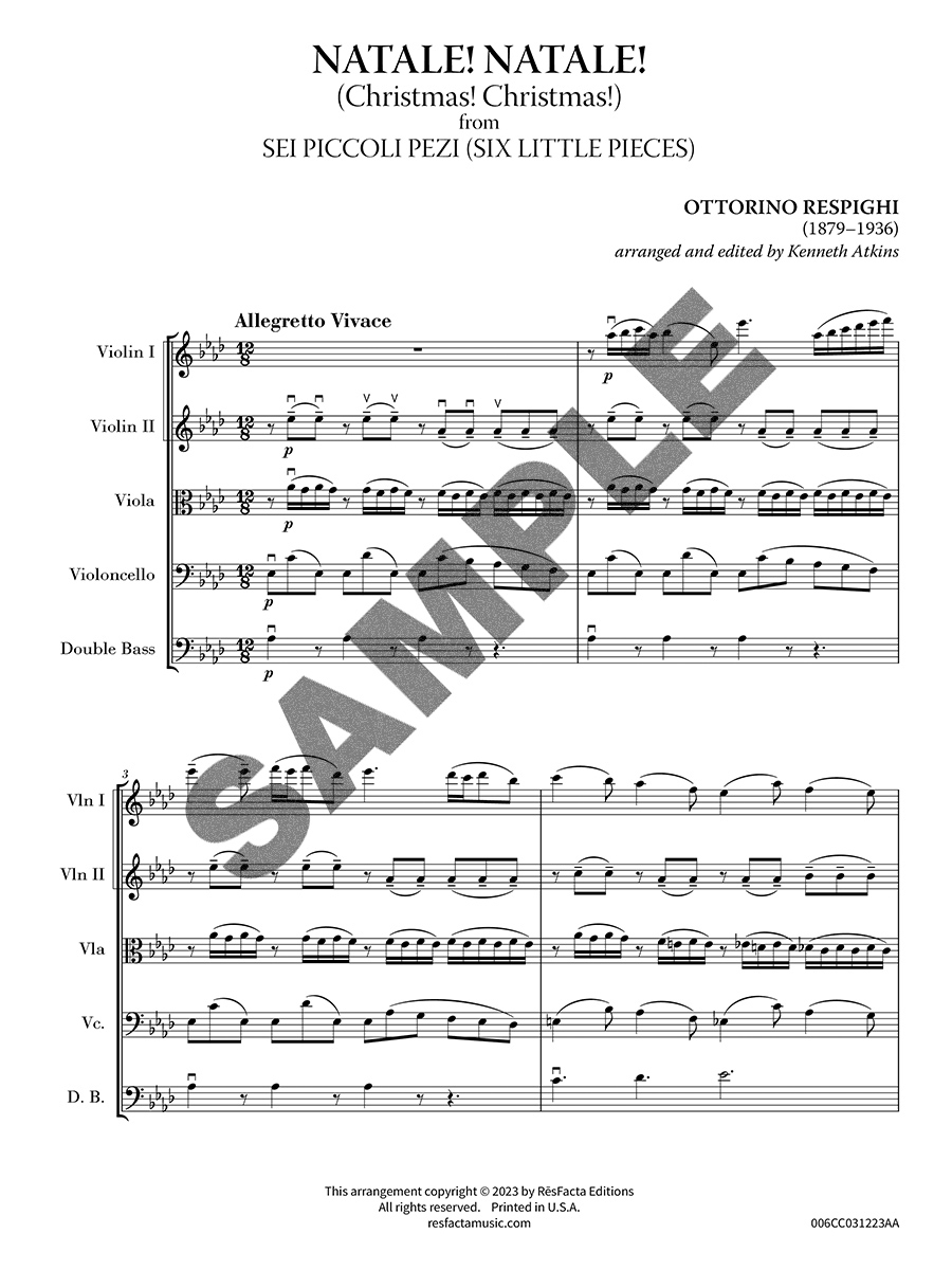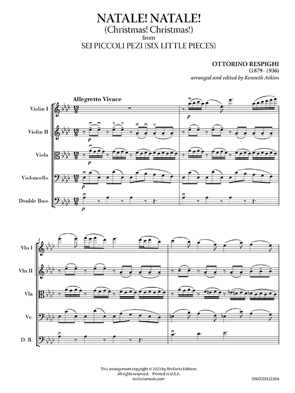 Italian composer, Ottorino Respighi was known for his skill in capturing the atmosphere and mood of various scenes and landscapes. “Natale! Natale!” (“Christmas! Christmas!”) evokes a sense of festive cheer and celebration, capturing a sense of nostalgia, joy, and festivity. Included are musical elements that bring to mind scenes of Italian Christmas festivities, the ringing of bells, and the excitement of gift-giving. Originally written for piano duet. Arranged for string orchestra.