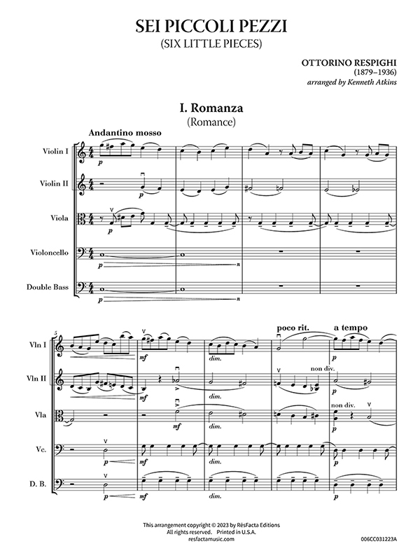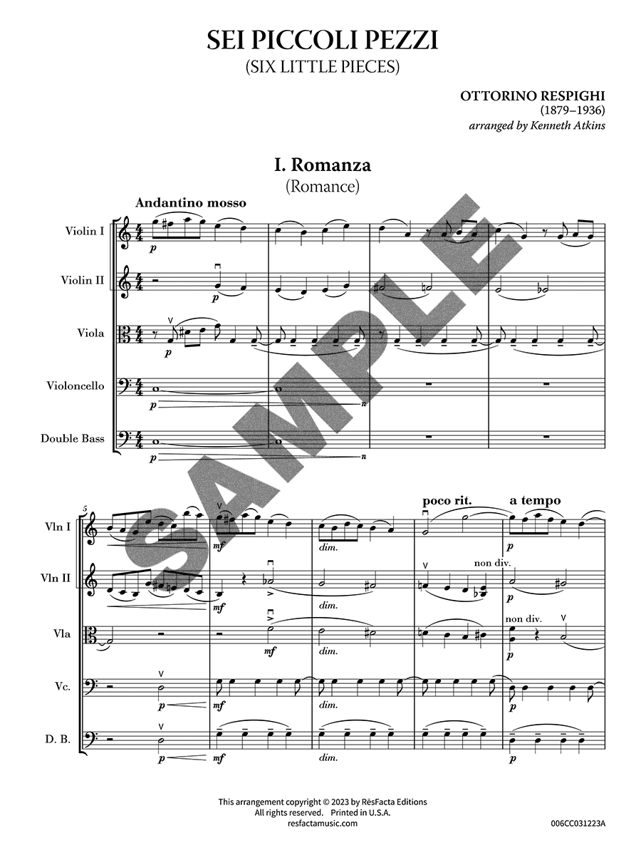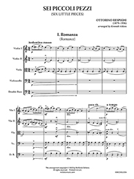 Originally written for piano duet by one of the leading Italian composers of the early 20th century — most famous for his three lavishly-orchestrated tone poems, Fountains of Rome, Pines of Rome, and Roman Festivals — these six little pieces are arranged here for string orchestra.